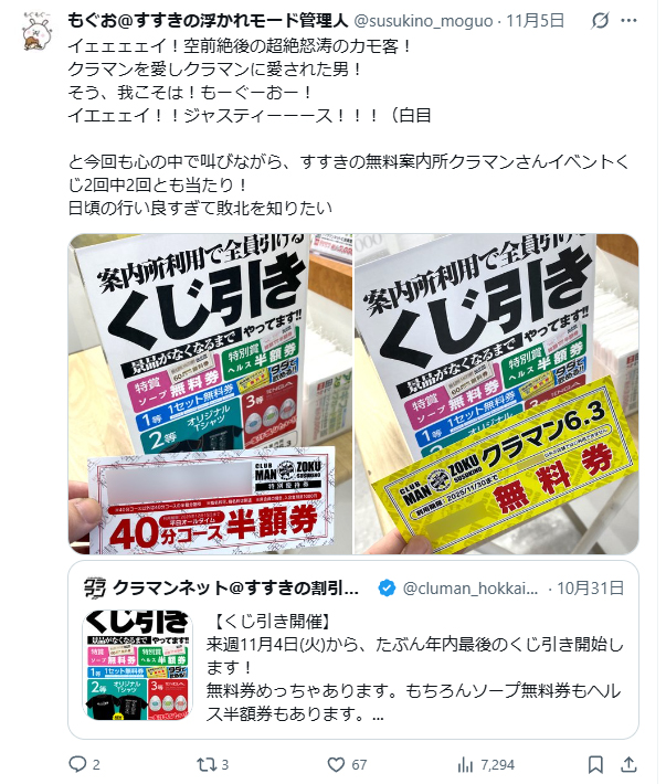割引チケットで安い金額でお得に飲みに行けて、さらに無料チケットまで当たるなんて…ありがとう、無料案内所クラマン6.3店さん!ヾ(・ω・`)ノ