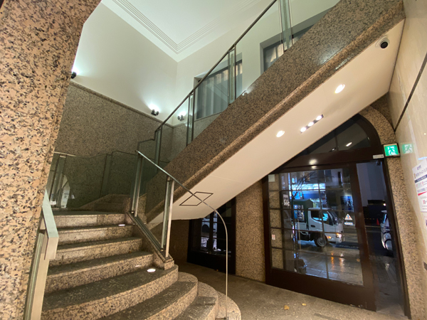 ビル入り口まで戻って、入り口横の階段を駆け上がります!